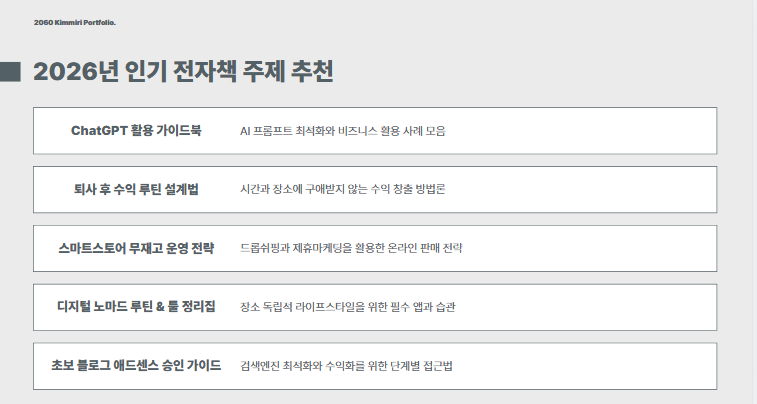3. 전자책 주제 추천 (2026년 기준 인기 키워드)