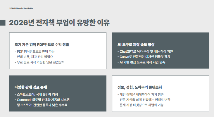 2026년은 콘텐츠 중심의 디지털 경제가 더욱 활성화되는 해입니다. 그중에서도 전자책은 진입장벽이 낮고 반복 수익이 가능한 대표적인 부업으로 주목받고 있습니다.